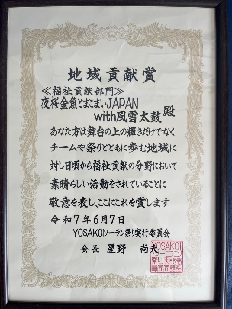 入所してる皆さんに目の前でYOSAKOIソーランを見て貰いたいと言う気持ちから継続して居ます。